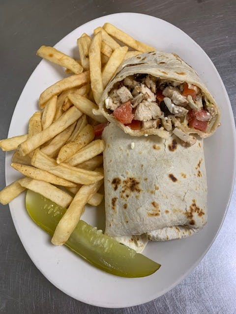 Chopped chicken breast, lettuce, tomato, onion, corn, shredded cheese and ranch dressing wrapped in a flour tortilla.